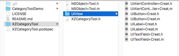 s.source_files的写法,第一次的时候写了好久都不对,验证的时候一直报错,所以在这里单独写一下,首先自己需要分享的文件是根目录XZCategoryTool里面的所有文件,该文件夹下的结构如下: