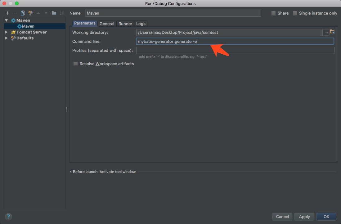创建插件配置文件 generatorConfig.xml,通过下图配置,运行该文件,在 Maven的 Command line:输入 mybatis-generator:generate -e 点击 ok: