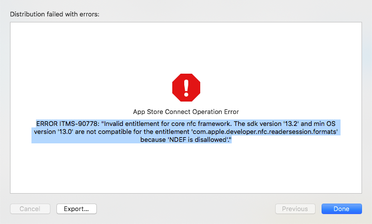 ERROR ITMS-90778:"Invalid entitlement for core nfc framework....because 'NDEF is disallowed'"