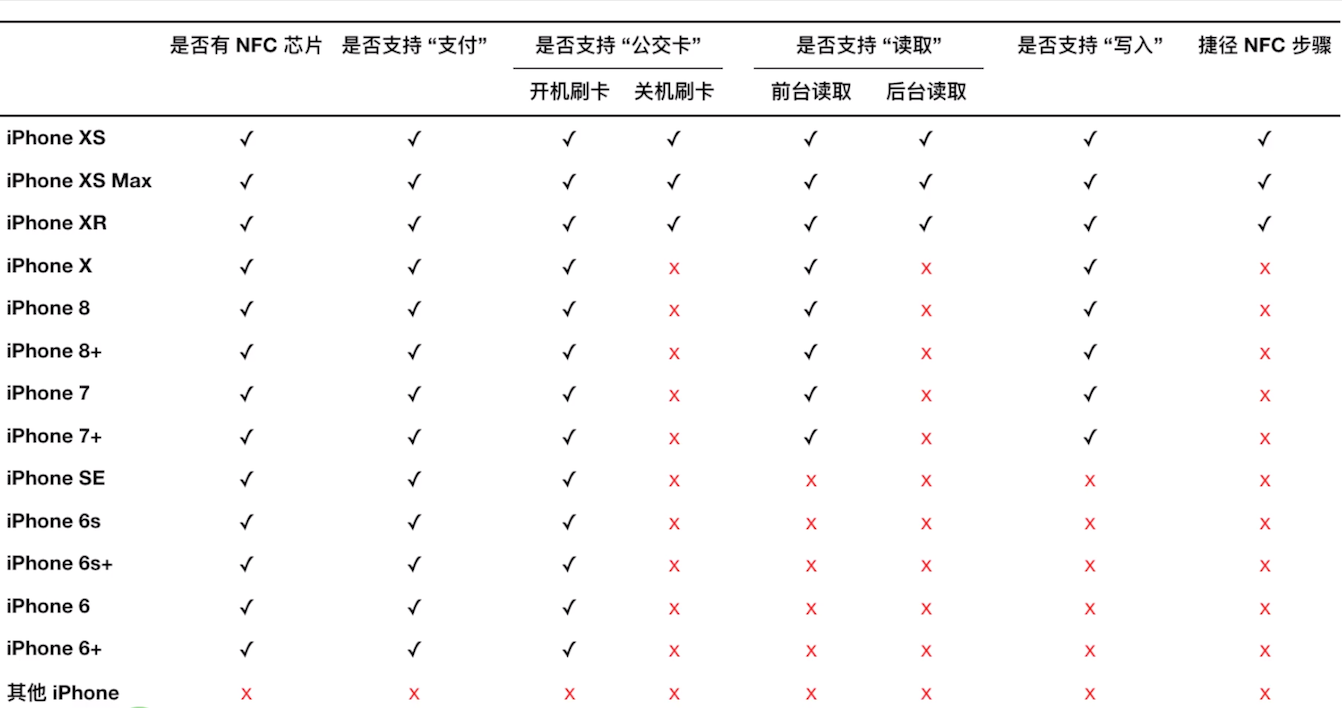 附上一张iPhone NFC设备支持表: